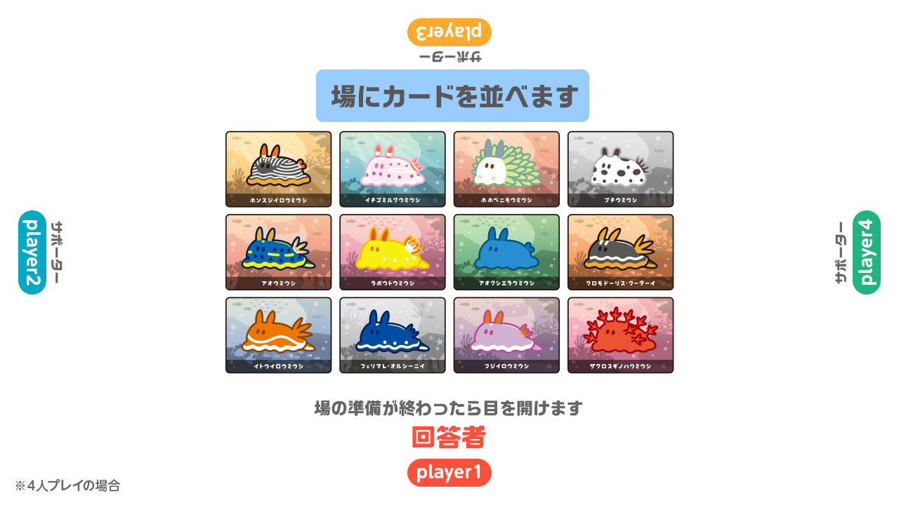 ※リアクションやおしゃべりは禁止ではありませんが、うみうしカード以外で露骨なヒントになるような行為はなるべく避けましょう。